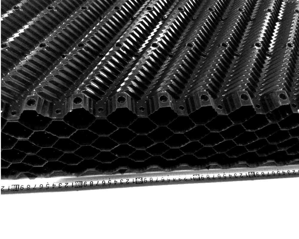 冷卻塔塔芯填料是由優(yōu)質(zhì)PVC聚乙烯片正負(fù)壓及吸塑而成,主要采用了水紋波形、梯形波、點(diǎn)波形、S波型、人字波形填料,散熱面積增長系數(shù)大,水流在板面上分布性能好,水和空氣流經(jīng)板面時(shí)擾動大等優(yōu)點(diǎn)。填料不易變形,耐高溫,抗老化,且阻燃性能好,風(fēng)阻系數(shù)小。安裝方便,易清洗,運(yùn)輸方便該散熱填料采用粘接式及懸掛式,安裝簡便,便于清洗,且成功解決了粘接填料因吸積垢、自重而產(chǎn)生變形,且變形后積垢更加嚴(yán)重、難于清洗的問題。填料阻燃性能好,阻燃氧指數(shù)指標(biāo)為42.7,每立方米組裝體質(zhì)量約為15 kg—30kg/m3,組裝高度為0.5m—3.0m,交錯(cuò)布置,對于塔壁周邊異形塊可視現(xiàn)場布置情況,按實(shí)際尺寸切割、安裝。